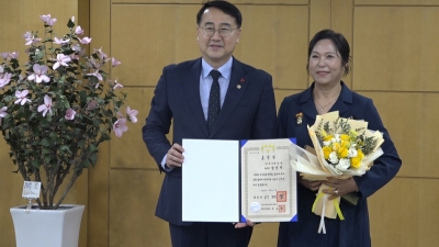 2026년 1월8일 정부 대전청사 산림청 회의실 '국가상징(무궁화) 보급 및 선양 정부포상 전수식'에서, 사)무궁화연대 정영희 상임이사 대통령표창 수상, 홍승원 이사 산림청장상 수상2026.01.09 mynews24